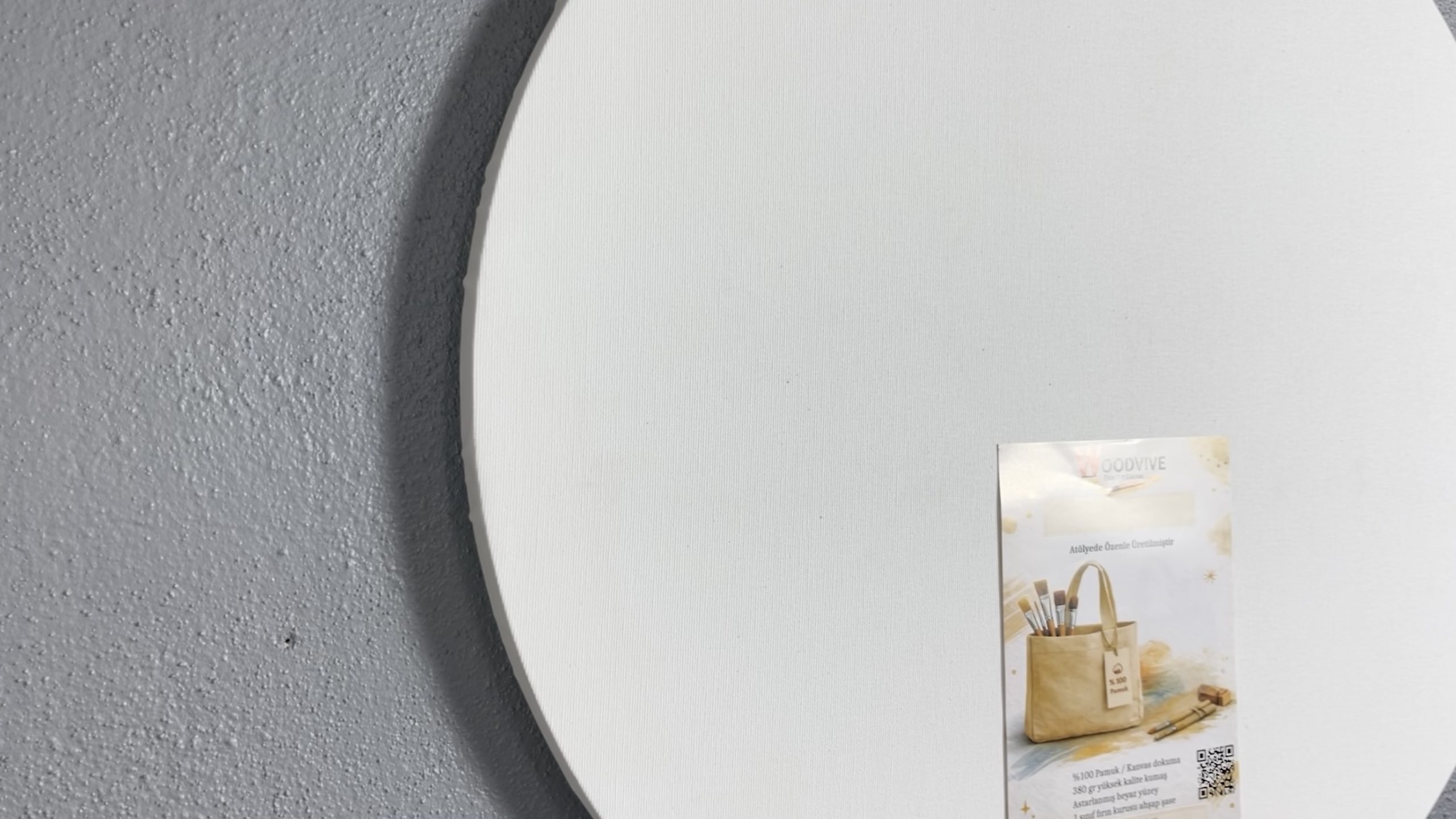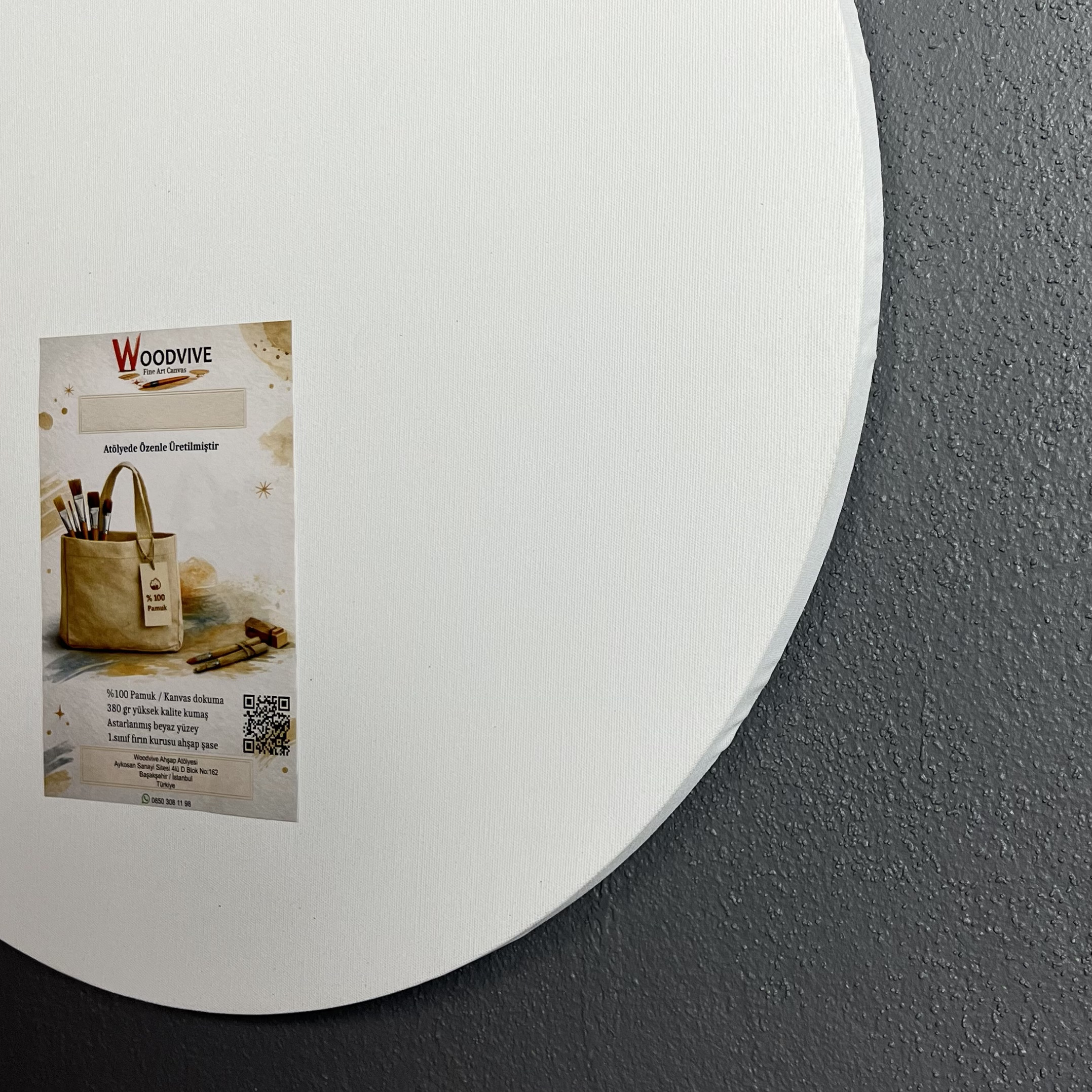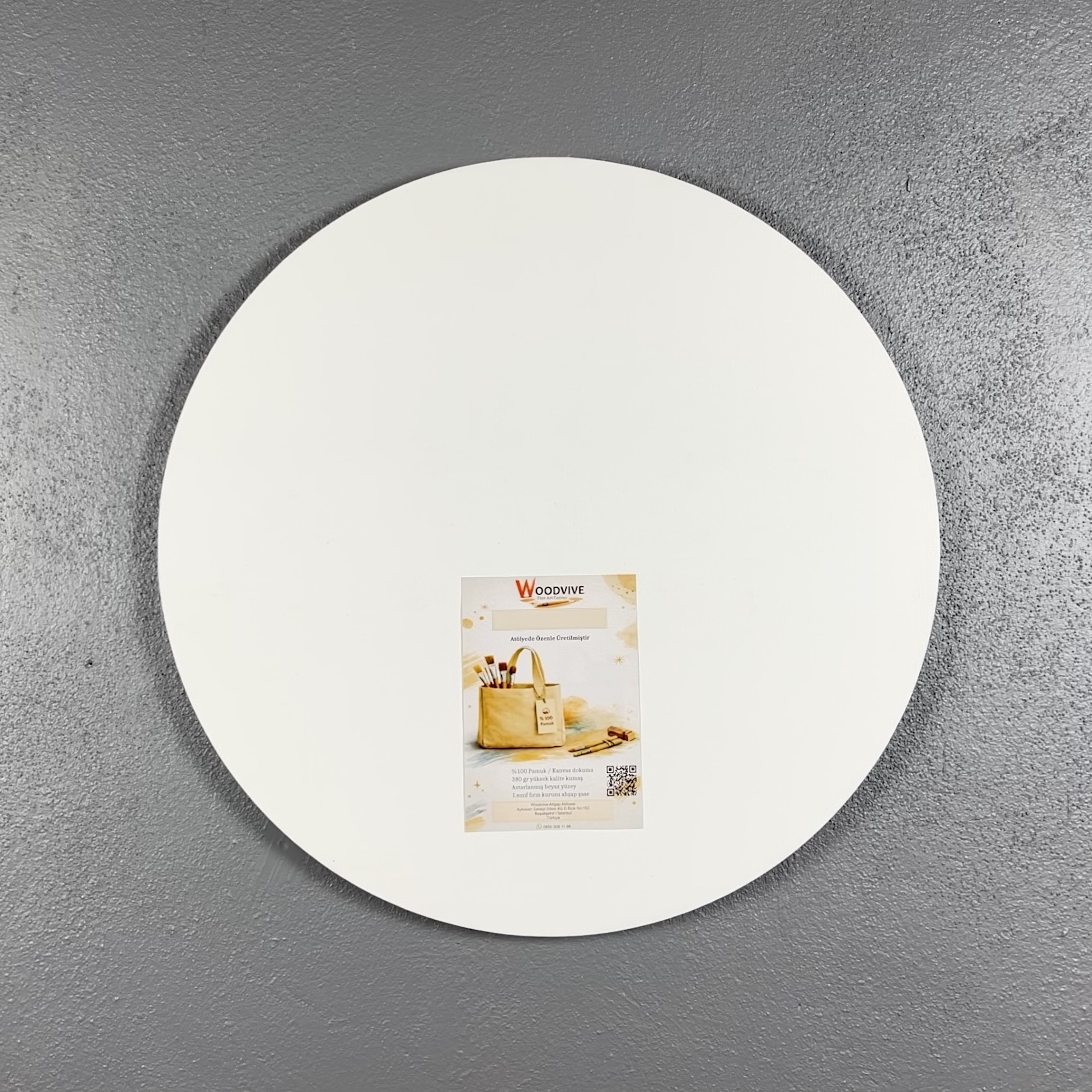 Çap seçenekli yuvarlak kanvas tuval, 380 gr %100 pamuk canvas dokuma kumaş ve sağlam 18×40 mm MDF şase ile üretilir. Sanat çalışmaları ve canvas baskı için ideal yüzey sunar.